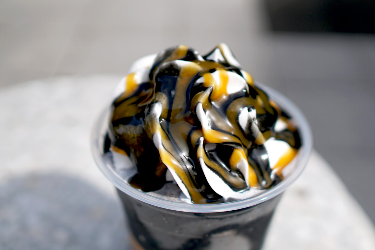 トッピングにも真っ黒なビターキャラメルソースがとろーり。ソースだけを味わってみたところ、意外にあっさりとしたキャラメル味。怖ーい見た目ほど、インパクトのある味わいではないのでご安心を。