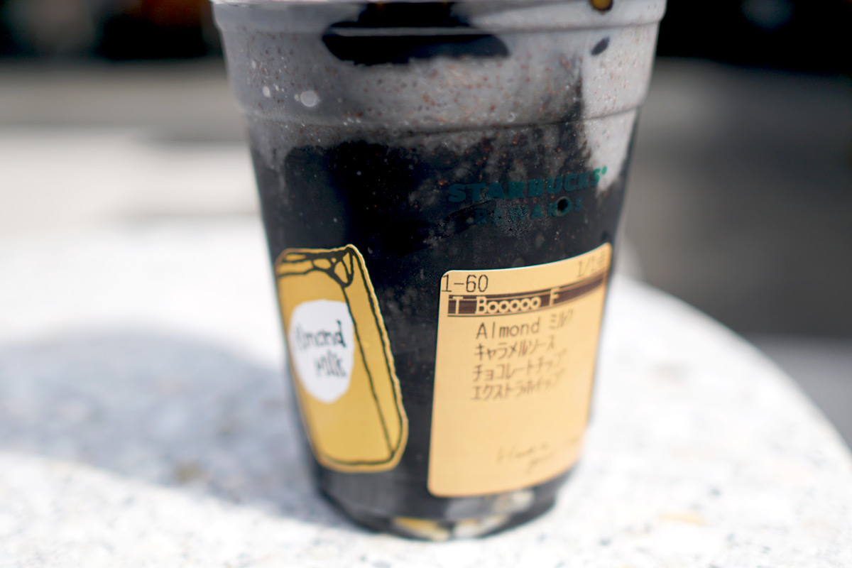 注意したいのは、その見た目の維持。カップの内側のソースが、時間とともに下がってきて、フラペチーノ本体のグレーが垣間見えてしまいます。写真を撮りたい方は、手早くお早めに。