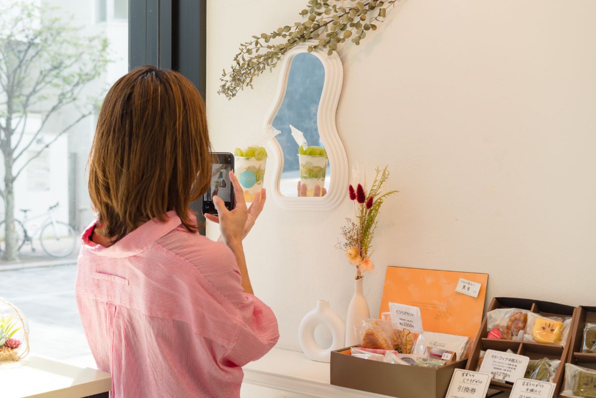 注文を受けてから盛りつけられる、カップにあふれんばかりのパフェを受け取ります。注文から受け取りまでは、約5分。店内の窓際に設けられたフォトスポットで、まずは一枚。上にのった繊細な飴細工が崩れないよう気をつけて。