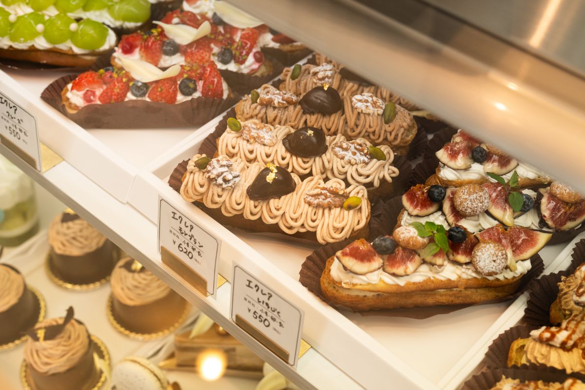 次にいただいたのは、宝石のようなデコレーションをまとった「エクレア」。ショーケースはいつまでも見ていたくなるほど美しく、私たちを惹きつけます。パフェと同様に旬のフルーツが使われており、シーズンごとにラインアップが変わります。