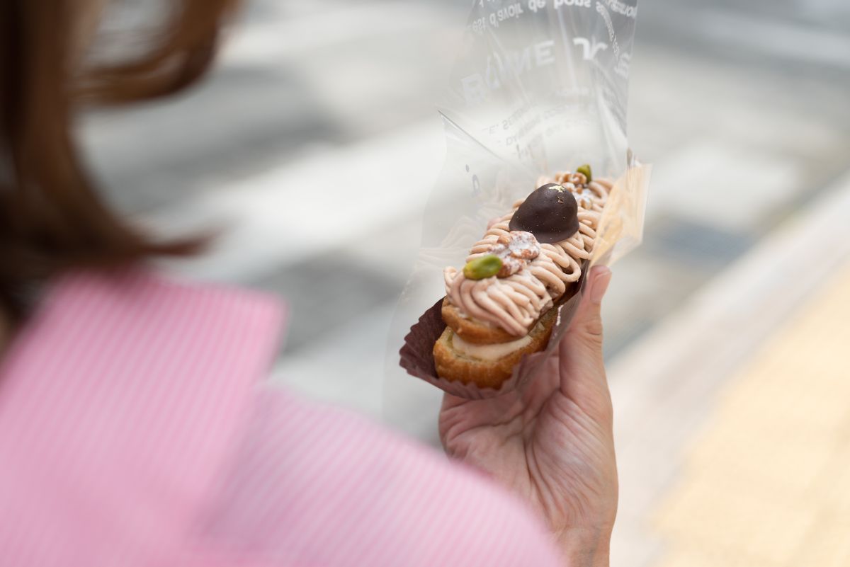 「エクレア」は、食べ歩きにもおすすめ。スタッフの方に伝えれば、テイクアウト用の包装紙に包んで渡してくれますよ。