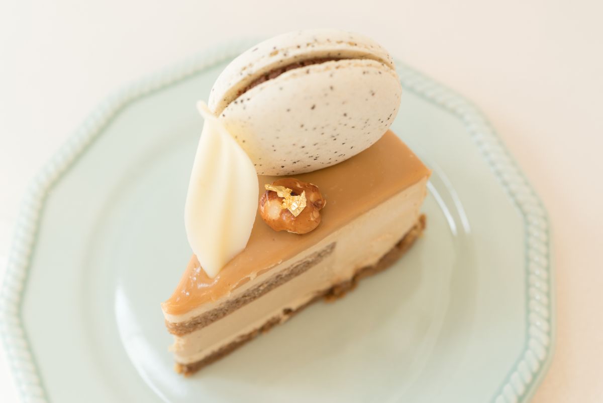 トッピングされた紅茶のマカロンをはじめ、中間層にはホワイトチョコと紅茶のソース、コーヒーとチョコレートのムース、そして紅茶の風味豊かな生地……。コーヒーと紅茶の組み合わせは未体験の味わいでしたが、そのゴージャスな味わいにうっとり。