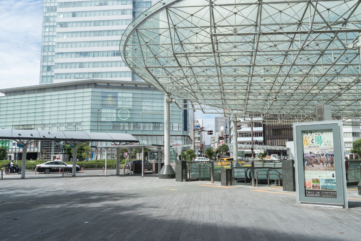 まずは静岡駅北口の地上出口を出て、左の広場方向に進みます。国道1号を挟んた向こう側に見えるのが葵タワー。ビル3階の窓に「SHIZUOKA CITY MUSEUM of ART」の文字が見えます。