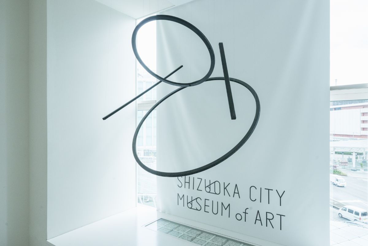 左の壁に描かれているのは静岡市美術館のロゴ。静岡を象徴する富士山をモチーフに、アートディレクターの柿木原政広さんがデザインしたもので、「視点の変化、見ることを楽しむ」という意図が込められているそう。