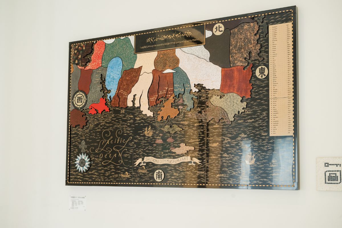 エントランスホールに飾られた作品「東海道五十三次ひとめ図」にも注目を。徳川家康が定めた東海道五十三次を、古地図をもとにして、静岡が誇る伝統工芸・漆芸(しつげい)を用いて制作したもの。