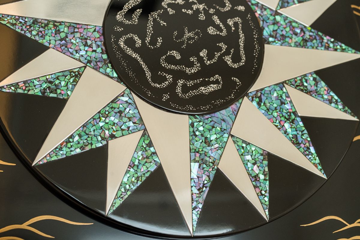 静岡市美術館のロゴをデザインした柿木原さんが指揮をとり、指物師、塗師、蒔絵師など、地元静岡の職人さんたちが手がけたアートには、駿河漆器独自のカラフルな変塗(かわりぬり)や、金粉で描く蒔絵(まきえ)、夜光貝を貼り付ける螺鈿(らでん)などの伝統技術がふんだんに用いられています。