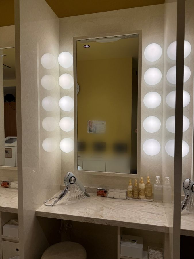 アメニティスペースには女優ライトが設置(女性用のみ)されているほか、基本的なスキンケアアイテムはすべて揃っているから、メイク道具さえあれば手ぶらでもOK!
