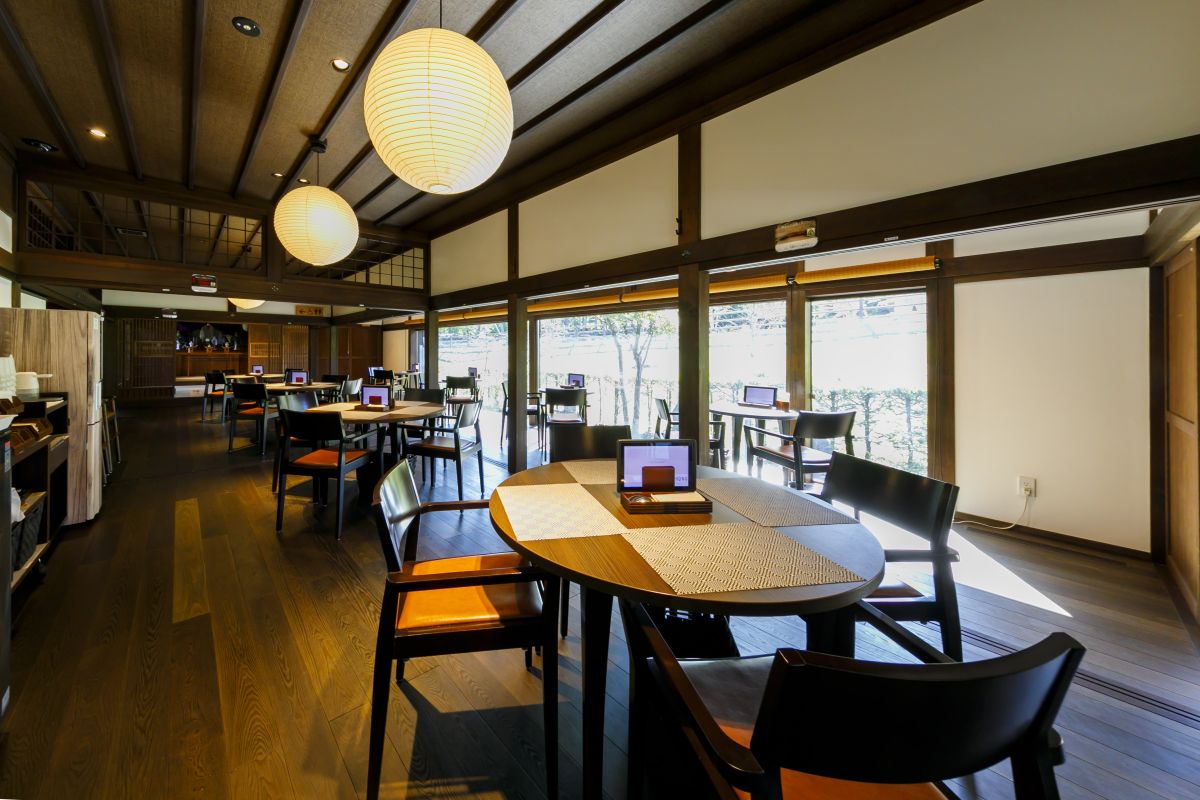 靴を脱いで中へ入ると、歴史を感じる造りの中にもモダンな雰囲気。壁一面ガラス張りの開放的な空間が広がり、目の前には富士山も望めます。四季折々の景色と落ち着いた佇まいになんとものんびりした気分になります。