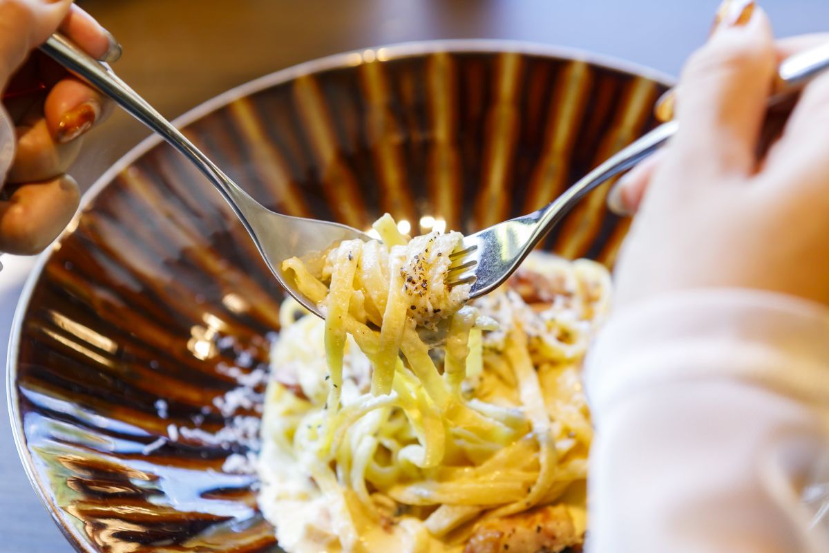 麺は、細長い平打ちのタリアテッレを使用。濃厚なソースとの相性も抜群。モチモチ食感もたまらない!また厚切りベーコンの旨味もしっかり感じられ、挽きたての粗めの黒コショウがアクセントに。