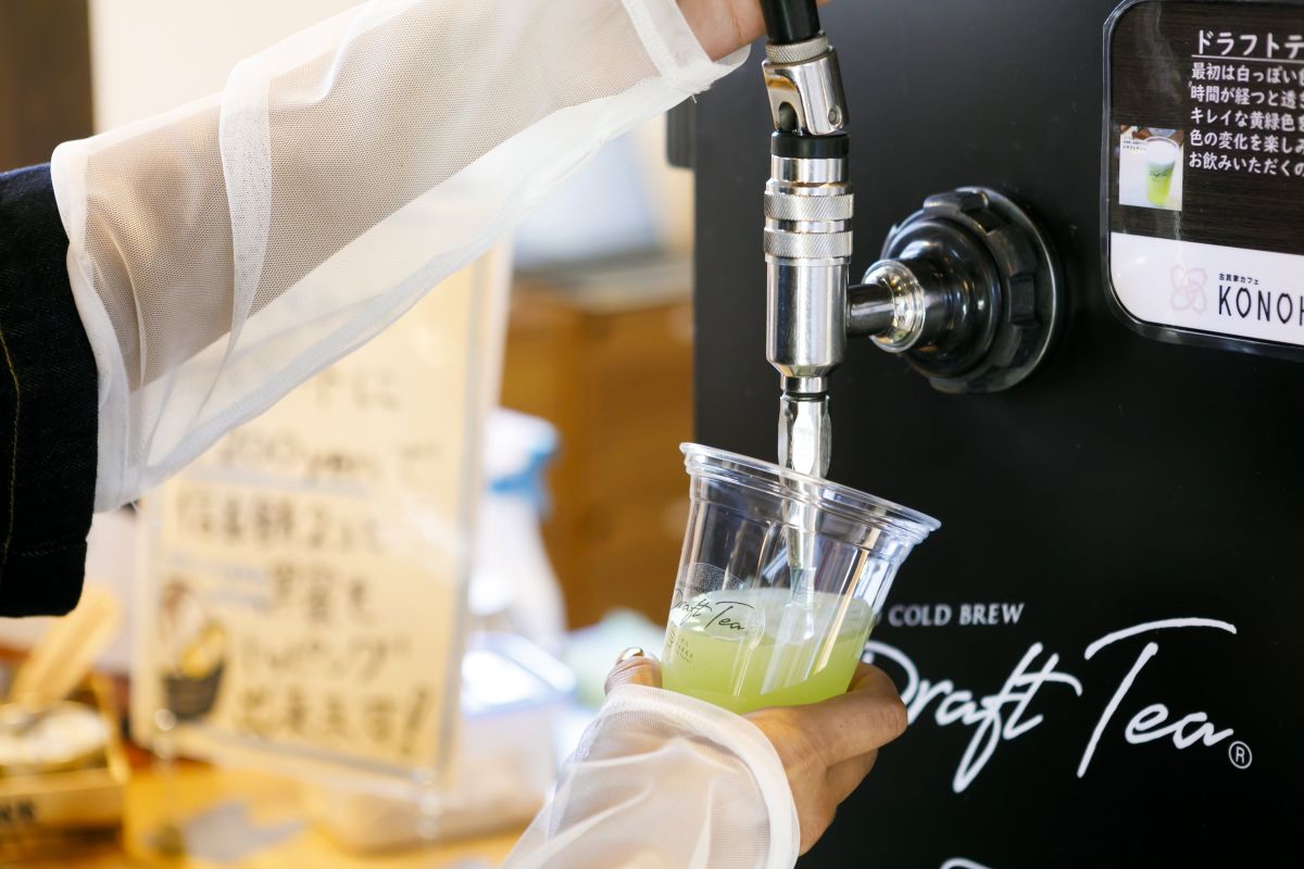 新感覚!特注のサーバーから自分で注ぐ一風変わった日本茶「ドラフトティー」。まだ日本でも飲めるお店は少ないそう。最初はきめ細かな泡で白っぽい色をしていますが、時間が経つと透き通ったキレイな黄緑色に変わります。