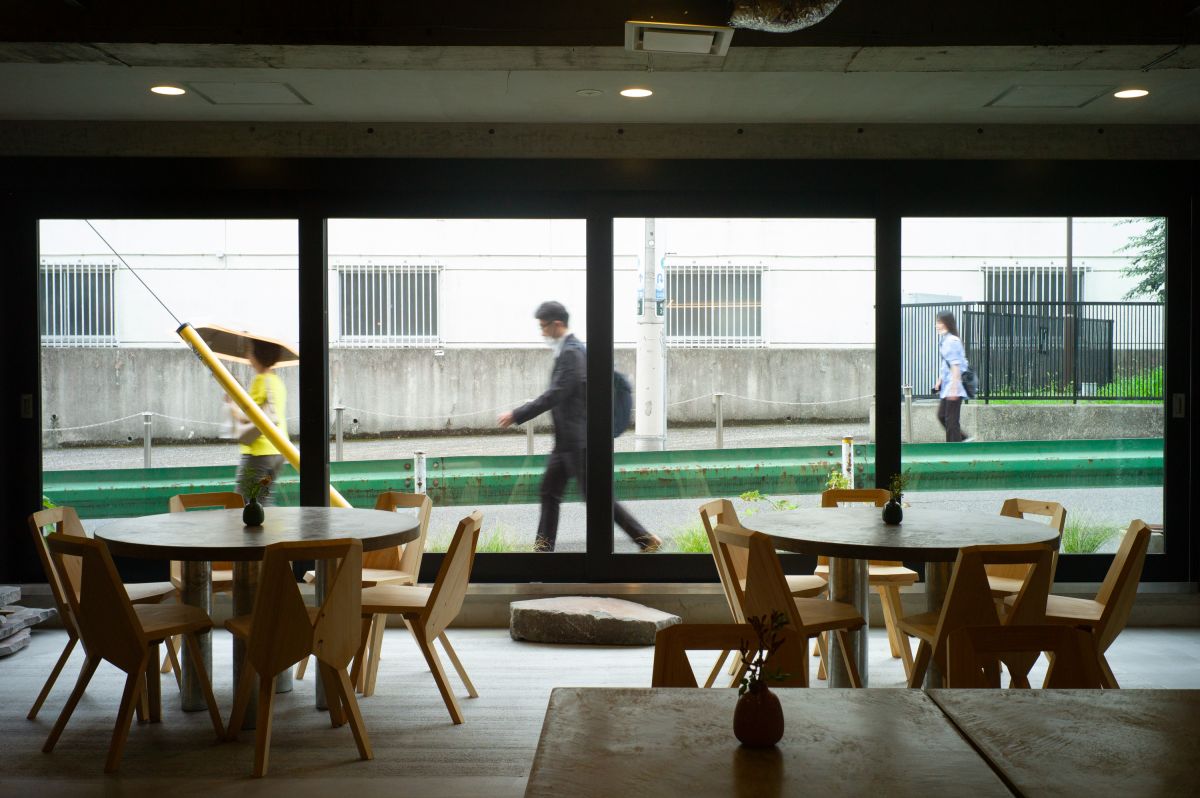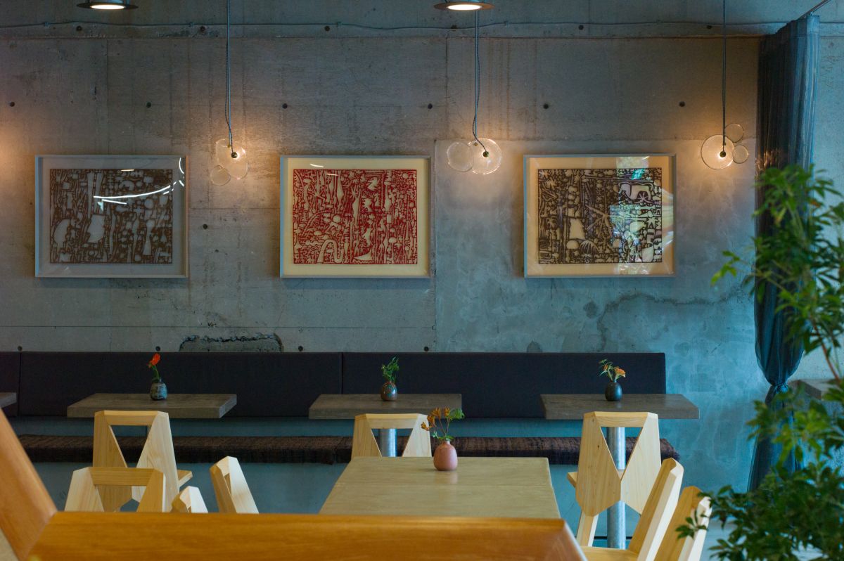 道路側はガラス張りになっていて、店内と街をゆるやかにつないでいます。店内にはアートが飾られ、石の天板のテーブル、日本の木材からできたイスなど、自然や手仕事の温かみが感じられる空間です。