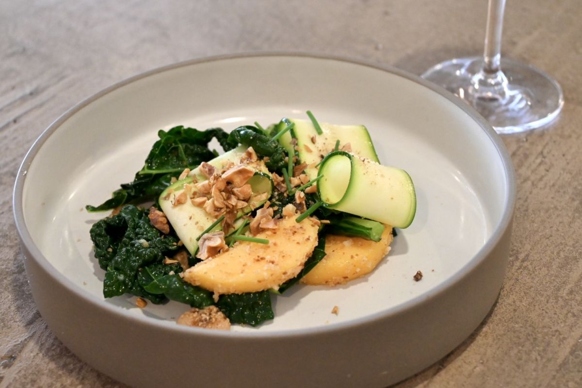 コースのメニューは時期によって変わります。この日は、カーボロネロ(黒キャベツ)やズッキーニ、柿などが、スダチの果汁とパセリのオイルを合わせたドレッシングで和えられたさわやかな風味のサラダ。ローストしたクルミがトッピングされ、食感の変化も楽しむことができます。