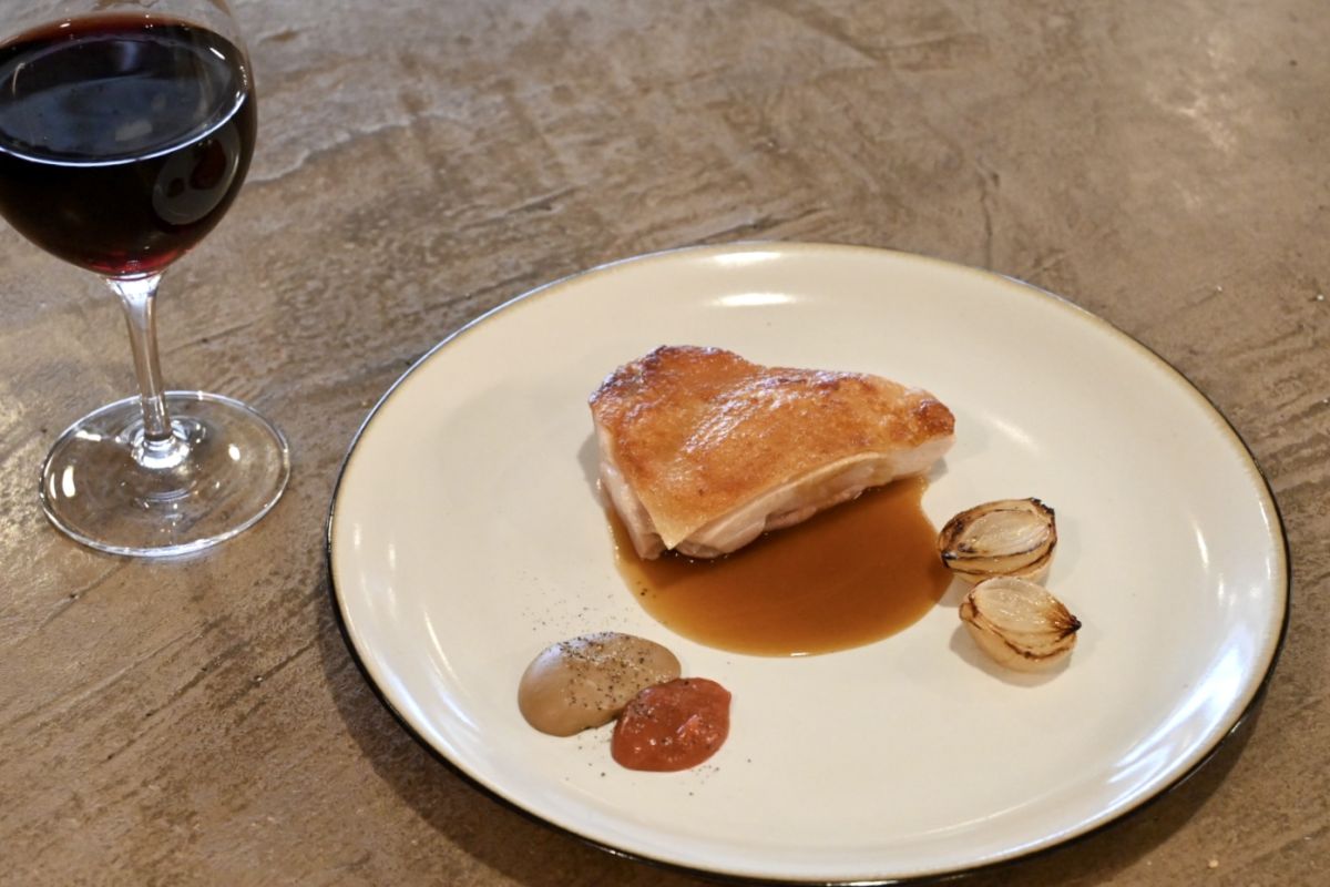メインは赤鶏というニワトリを使用したローストチキン。前日から鶏肉の皮の部分だけを乾燥させることで、パリッとした食感に仕上げているそう。ソースは、果肉をブレンドしたプラムジュースに、お酢や醤油、赤鶏の骨のだしなどが加えられています。赤鶏のレバーを使ったレバーペーストも添えられています。