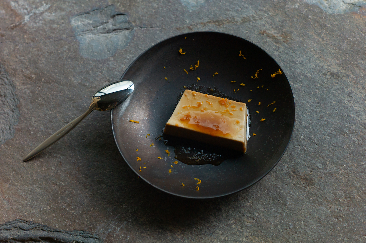 デザートは、瀬戸内の和紅茶を使用したプリン。3年熟成させた「福みりん」を煮詰めてカラメルのようにした風味豊かなソース、オレンジの皮を粉砕したオレンジゼストがトッピングされています。