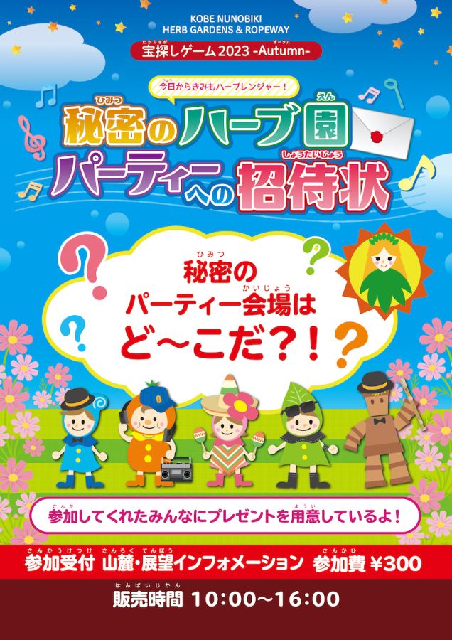 「秋の大音楽祭」をテーマに、ハーブの女神さまからの招待状(マップ)を元に、パーティー会場を見つけるとごほうびが待っているというストーリーで、子どもから大人まであらゆる世代に大人気の「宝探しゲーム」の秋バージョンが登場します。