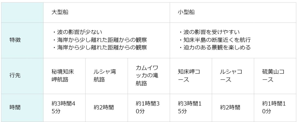 ※コース名&データ…大型船は道東観光開発おーろら社、小型船はゴジラ岩観光のものです。