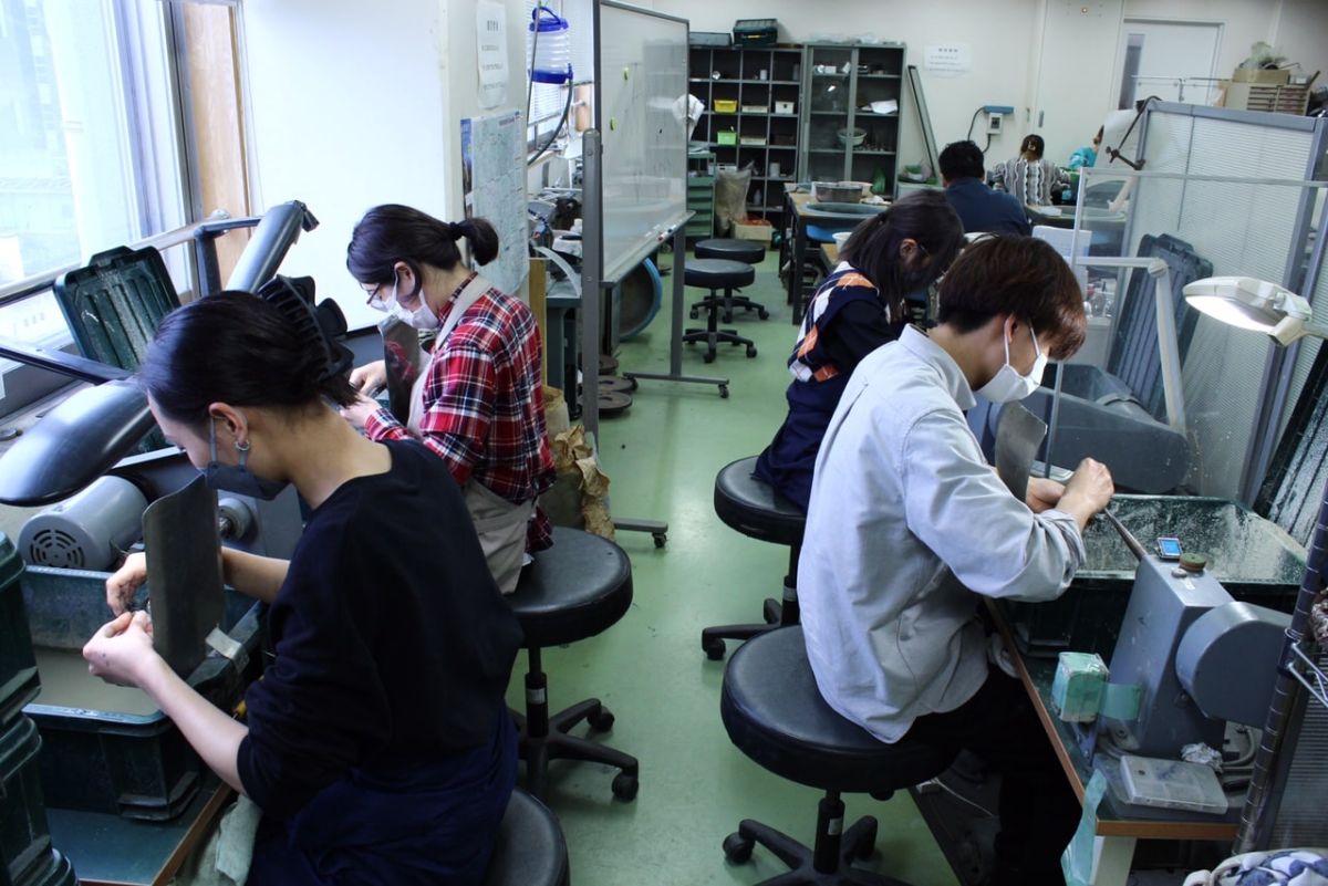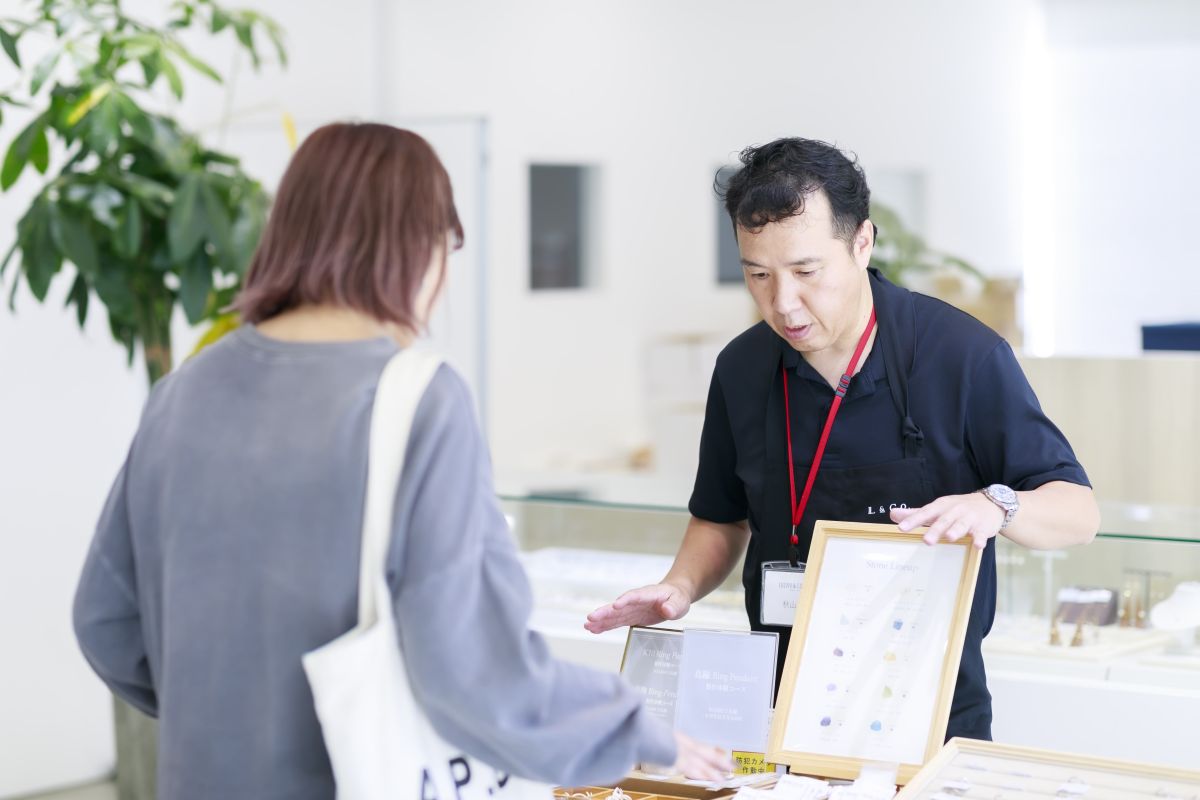 「見学やジュエリーづくり体験を通し、お客さんの反応を見られることがやりがいにつながる」と語る技術部制作室課長兼マイスターの秋山優(あきやまゆう)さんは、なんとこの道30年!ラッキーアンドカンパニーではこうした熟練の職人たちが、日々手に取る人を喜ばせるジュエリーづくりに邁進しています。
