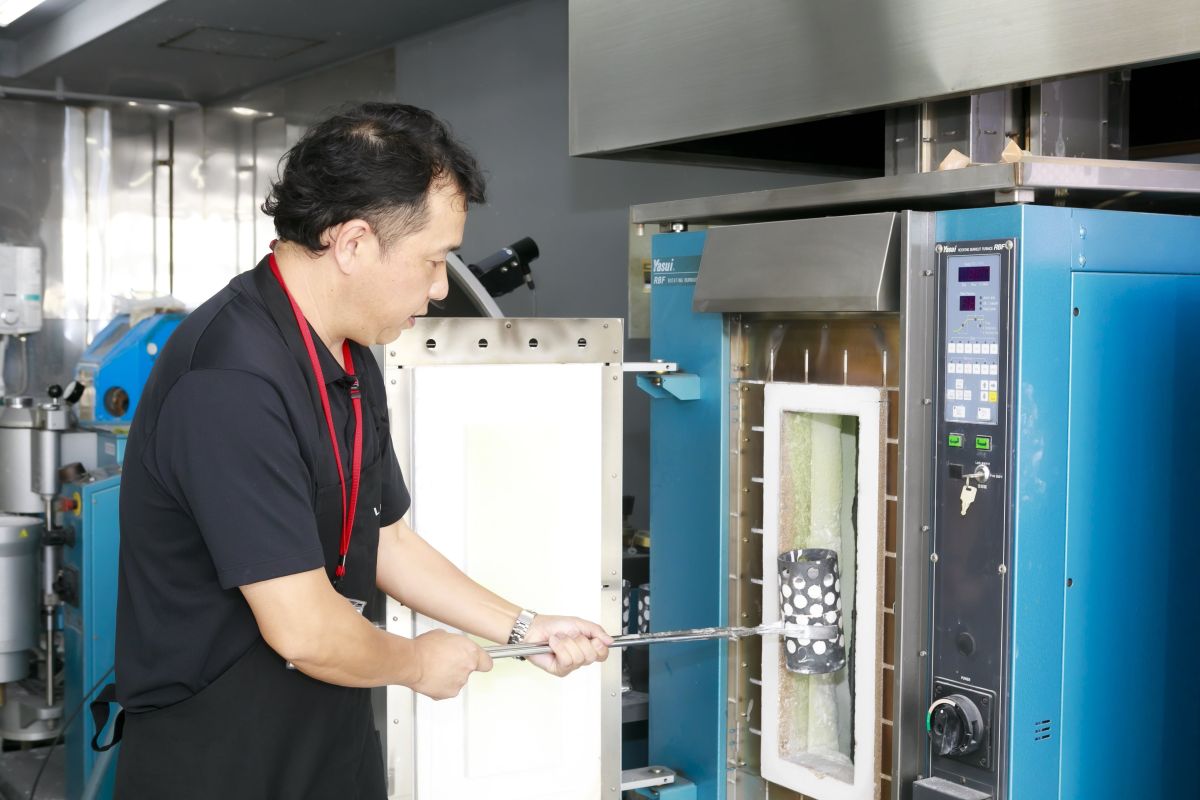 立体模型のワックスツリーを金属の筒で覆い、石膏を投入。約10時間かけて700℃まで加熱することでワックスが燃え尽き、溶かした銀を流し込むと、ワックスツリーの模型と同じシルエットのシルバー原型が鋳造されます。