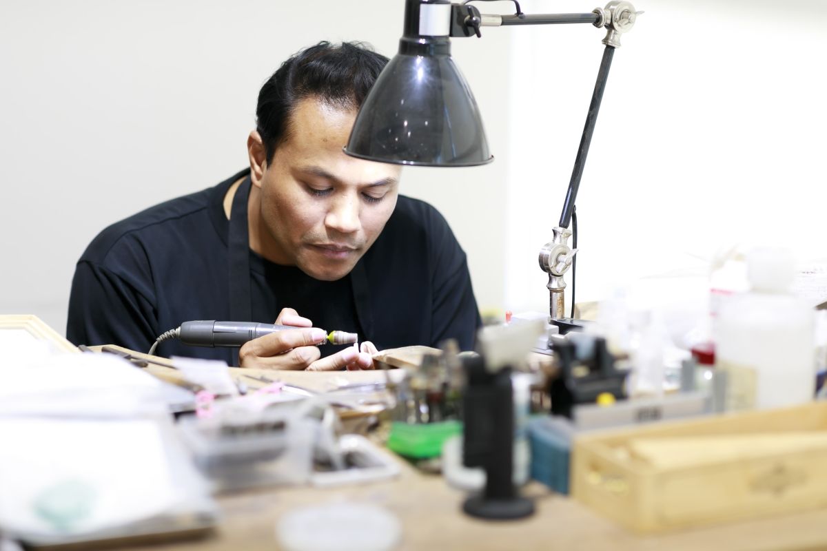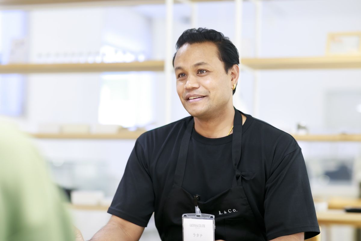 「納得がいくまでとことんこだわる、日本人のものづくりに対する思いに感銘を受けます」そう話すのはネパール出身の技術部制作室課長、ラタナ・サッキョウさん。故郷の家が代々宝飾の仕事をしており、ジュエリーの輸入販売を営んでいた父親を追って25年前に来日。山梨県立宝石美術専門学校で2年間日本の宝飾を学んだ後にラッキーアンドカンパニーへ。今年で職人歴23年を迎えるそう。