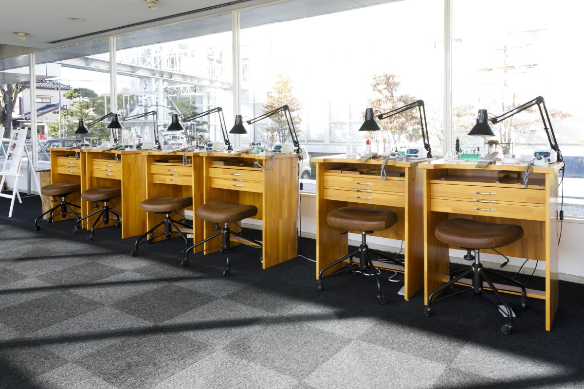 素材選びが終わったらいよいよ体験スペースへ!ひとりずつ作業台が用意されています。見たことのない道具や機材にドキドキ…。今回の体験ではネックレス作りを選びました。