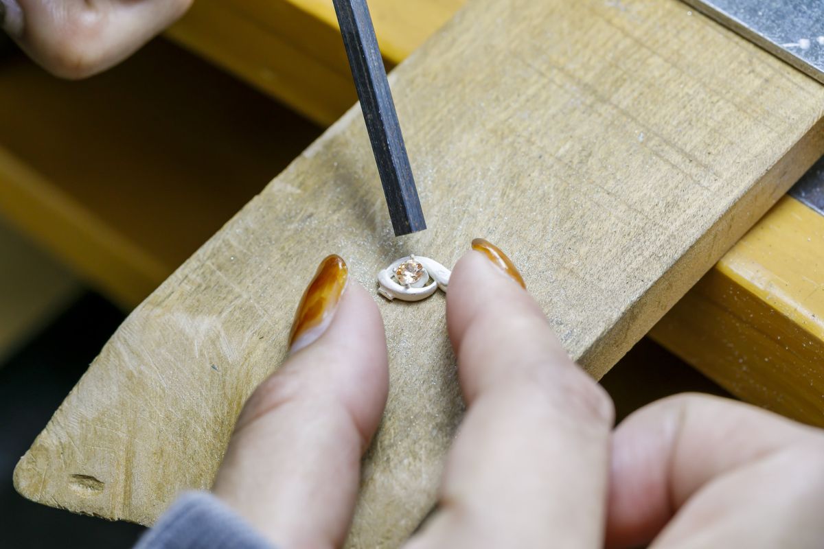 作業台に座ったら、まずはネックレスのヘッドとなる部分の石留め作業からスタート。やすりがけした地金に石を置き、石を支える金具部分を接続していきます。この時石がずれないように、対角順に金具部分を倒していくのがポイント!それにしても結構力がいる…。