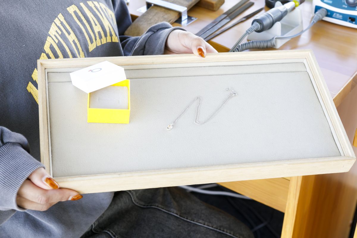 Lucky Open Factoryのオリジナルジュエリーづくりでは、ネックレスやリング、キーホルダーなどのベースを選んで、石留めや磨きなどの工程を体験することができます。職人さんがひとりひとりしっかりサポートしてくれるので、初心者でも安心。ぜひ友人や恋人と一緒にトライしてみてください!