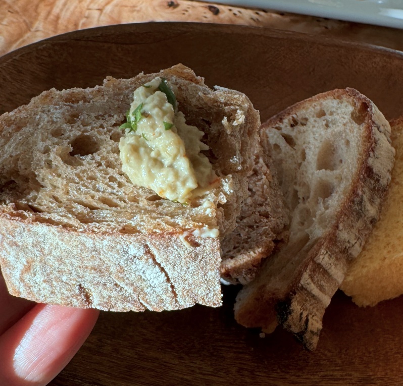 写真は、独自の焙煎大麦粉を使用し、一般的なレシピよりも水分量の多い生地をモチモチ、しっとりと焼き上げた「大麦高加水パン」とごまの風味が濃厚な「ババガヌーシュ」の組み合わせ。
