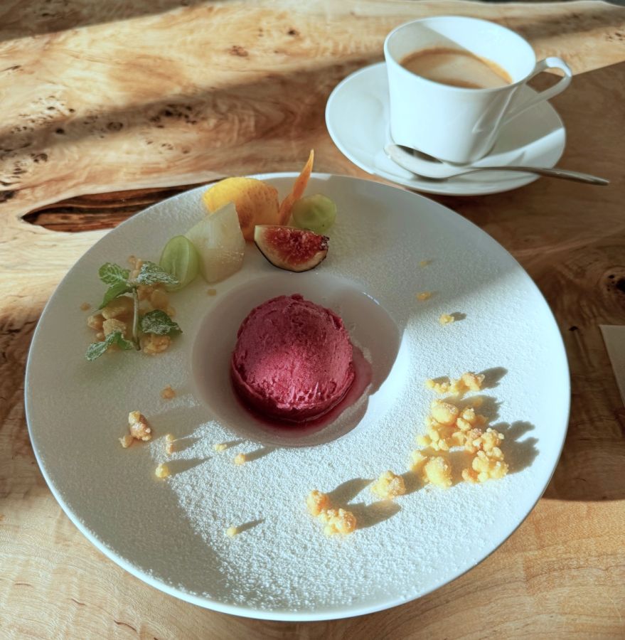 シャインマスカットや黒いちじく、庄内柿など、みずみずしい季節のフルーツと、サクサクした食感のクランブルが添えられています。