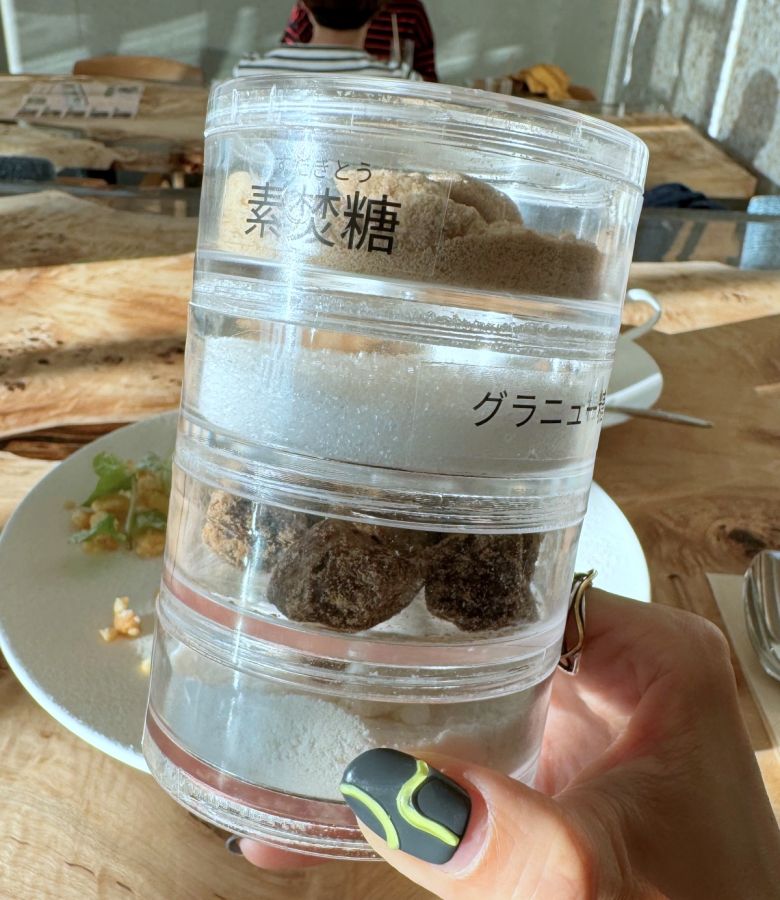 食後のドリンクにはこだわりの紅茶かコーヒーが選べ、ホットには「素焚糖」「黒糖」「グラニュー糖」「てんさい糖(シナモン風味)」の4種類のお砂糖が付いてくるんです!