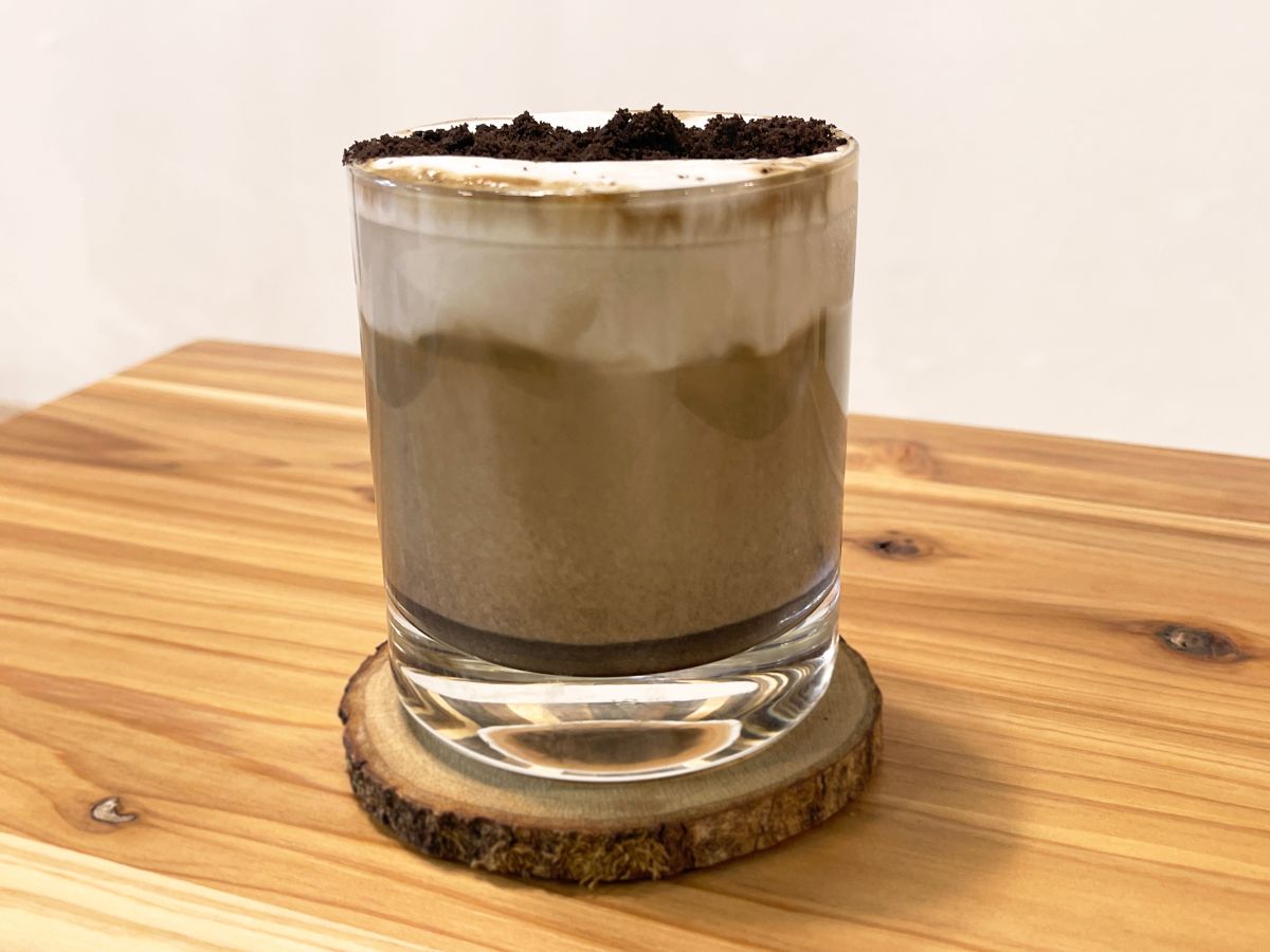まろやかでほんのり苦みを感じるラテは、チョコサンドクッキーやはちみつの甘みが良いアクセントに。色あいがグレーになるようチャコールパウダーを使っているのだそう。