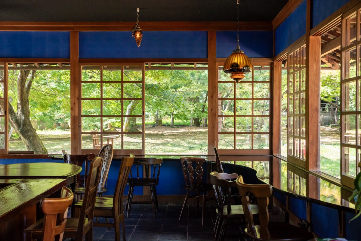 天気の良い日は屋外でカフェメニューを味わえます。オーナーの作庭した自慢の庭を存分に眺めることができ、特に秋には真っ赤に染まった紅葉を楽しめます。