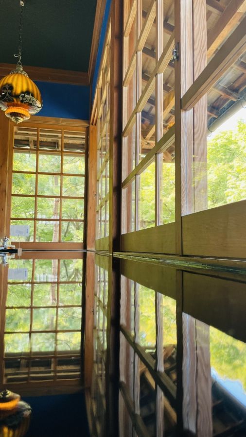 こちらのカフェの魅力はなんといってもその美しい内装です。店内奥の席に座ると、庭の景色がテーブルに反射し、まるで水面に映っているよう。ところでこの景色、どこかで見たことありませんか?実はこのカフェのオーナーは、リフレクション紅葉で有名な瑠璃光院の庭を手がけた作庭家なのです。