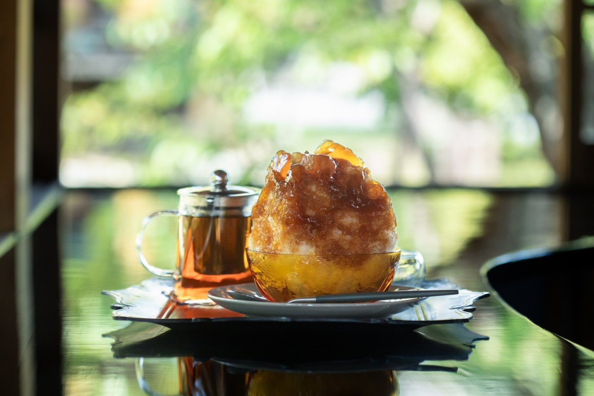 最初にご紹介するのは、看板商品のかき氷です。トッピングにも中にもプルプルのわらび餅が入っていて、贅沢な一品。黒糖蜜は濃厚で、季節問わずに食べたくなります。こちらは通年メニューですが、ほかにも季節ごとにさまざまな味のかき氷が登場しますよ。