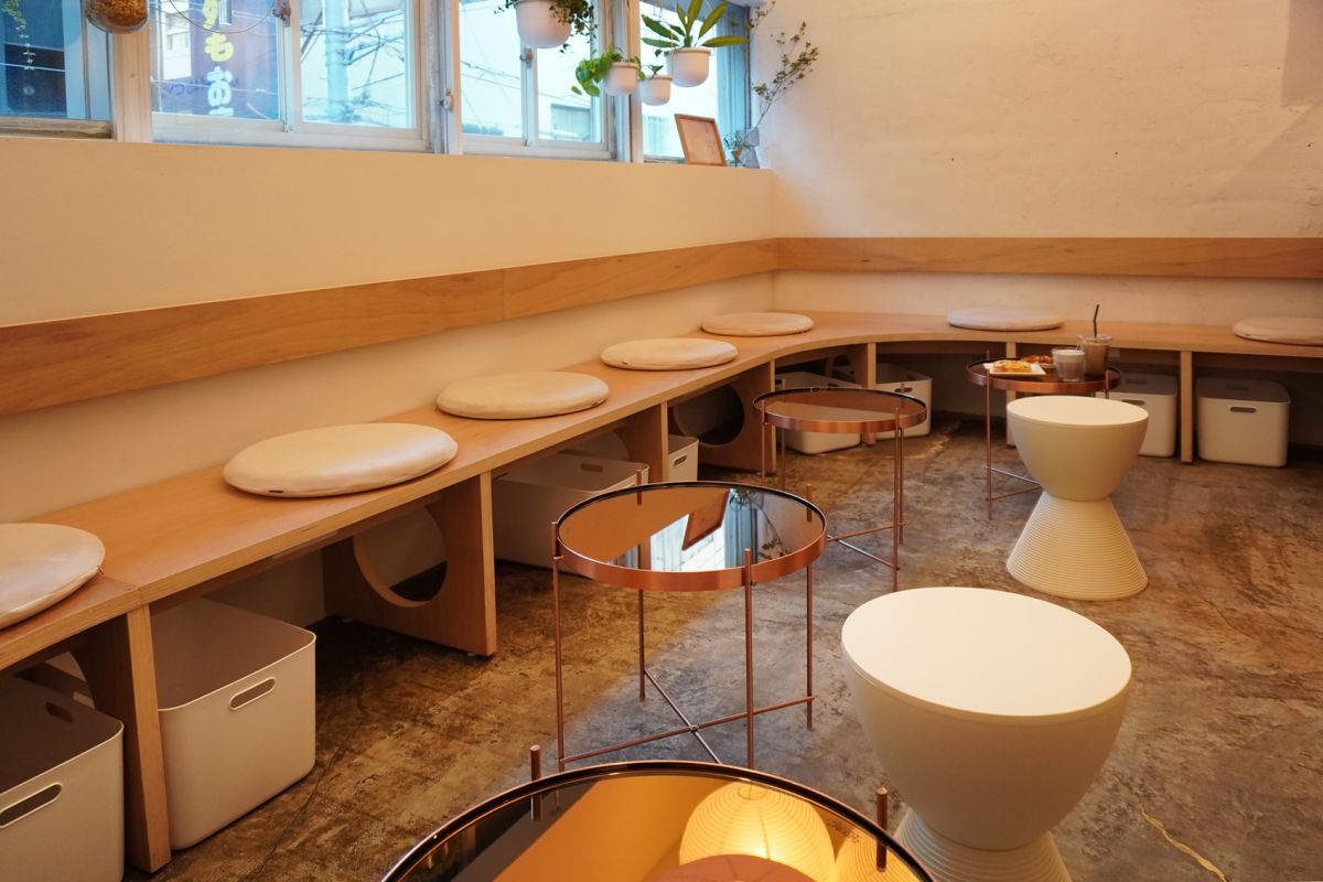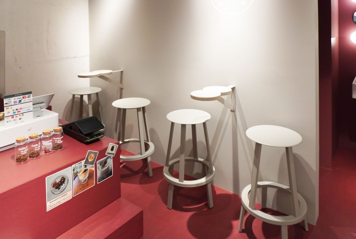 階段を上がってすぐのところには、おだんご型のカタチがユニークなハイテーブルとスツールの席があります。