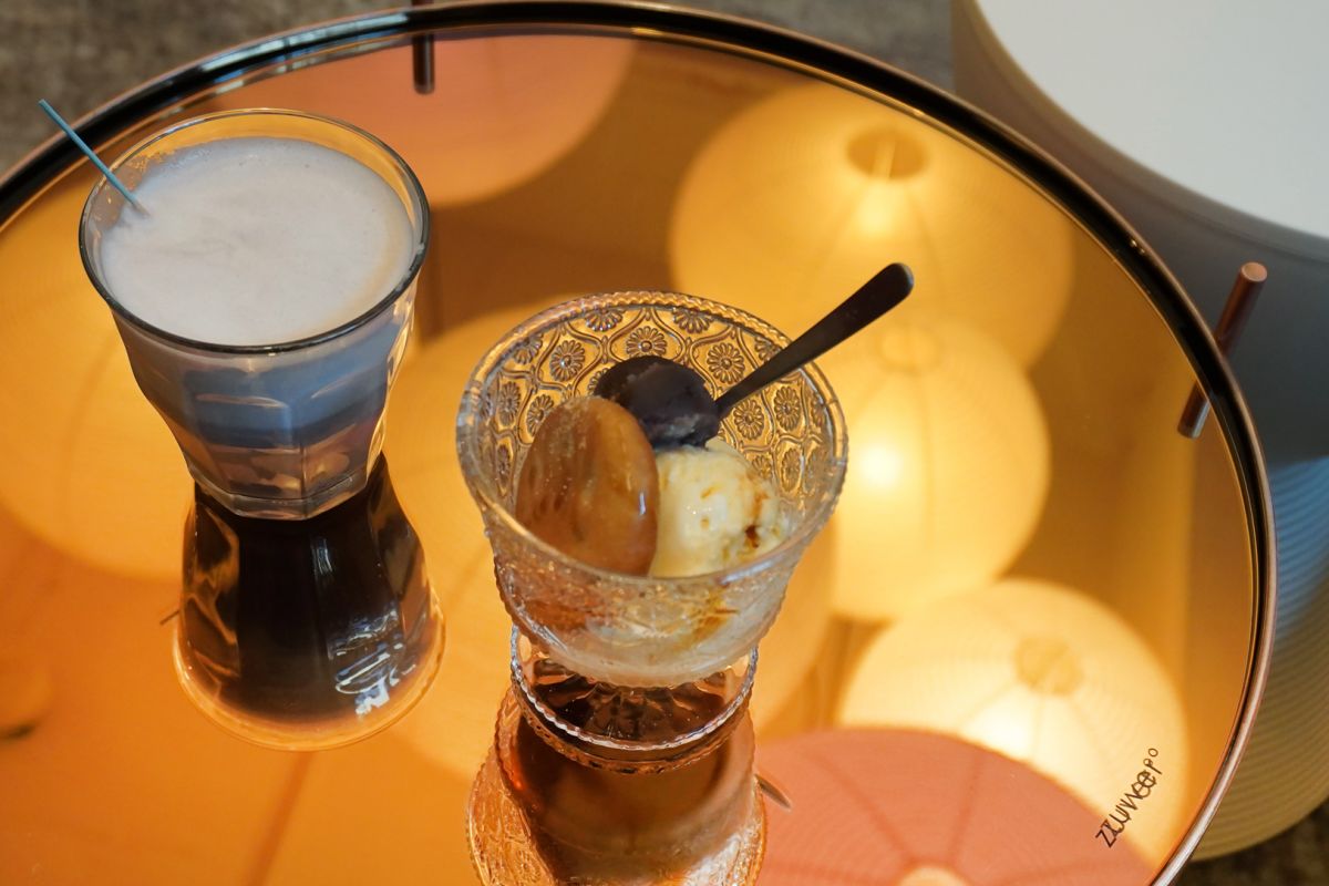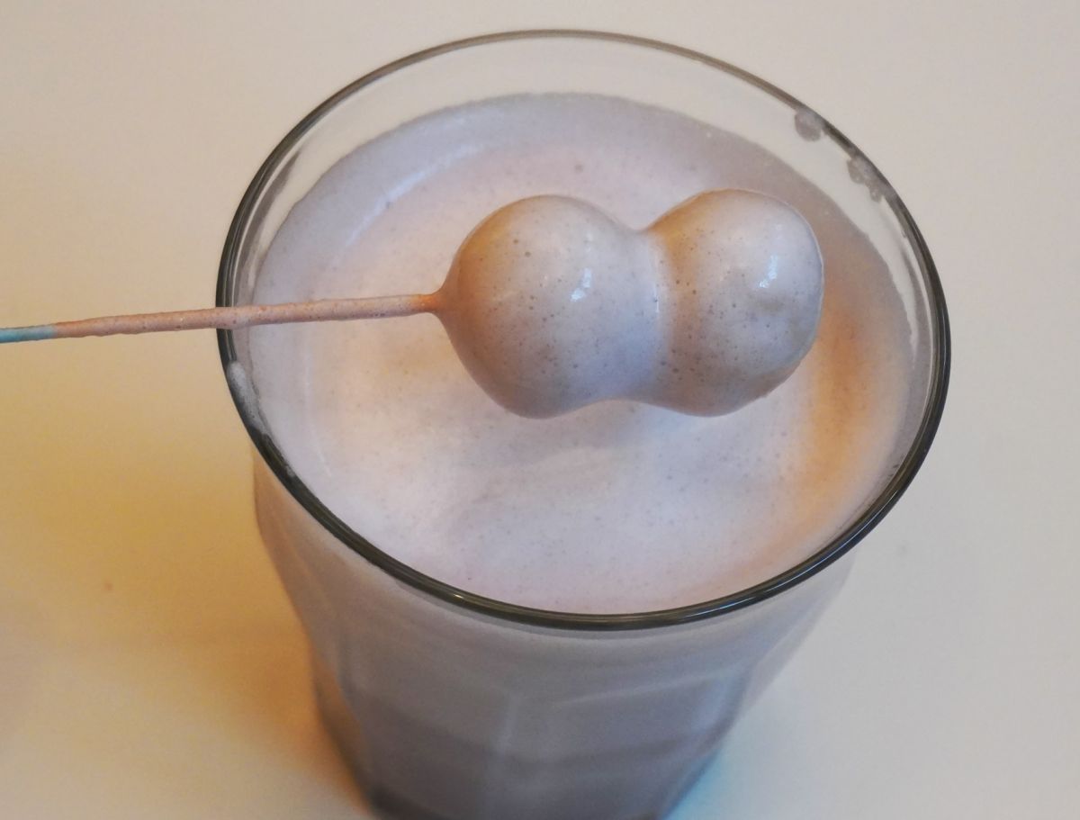 「このきれいな紫色は、“しゅまり”で作る餡だから出せる色なんです」とスタッフの田沼彩乃さん。やさしい甘さで、ほっこり和む味わいです。ラテには串に刺さった小さな白玉が添えられていて、グラスの底に沈んでゆくあんこを、白玉でくるくる混ぜながらいただきます。最後はグラスの底に残ったあんこを、モチっとやわらかな白玉に絡めて味わいましょう。添加物のないピュアな味は、後口がいいのも魅力です。