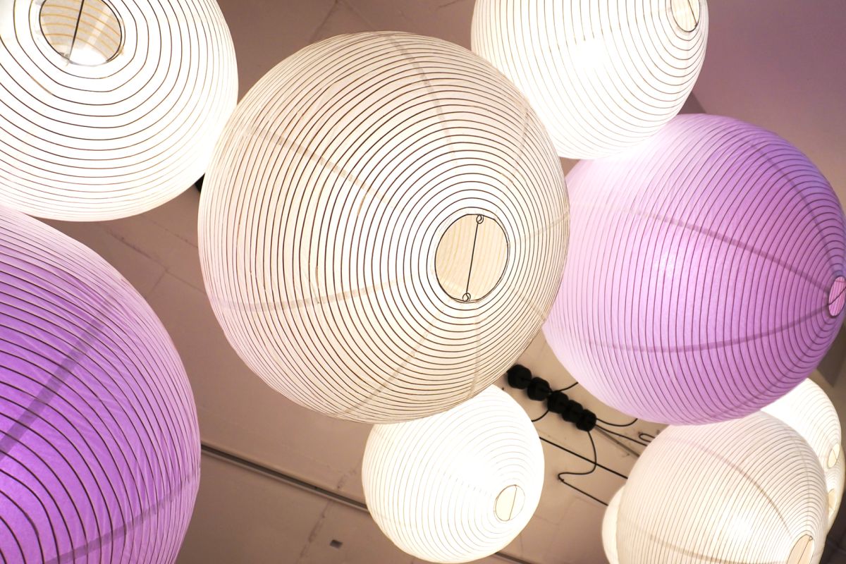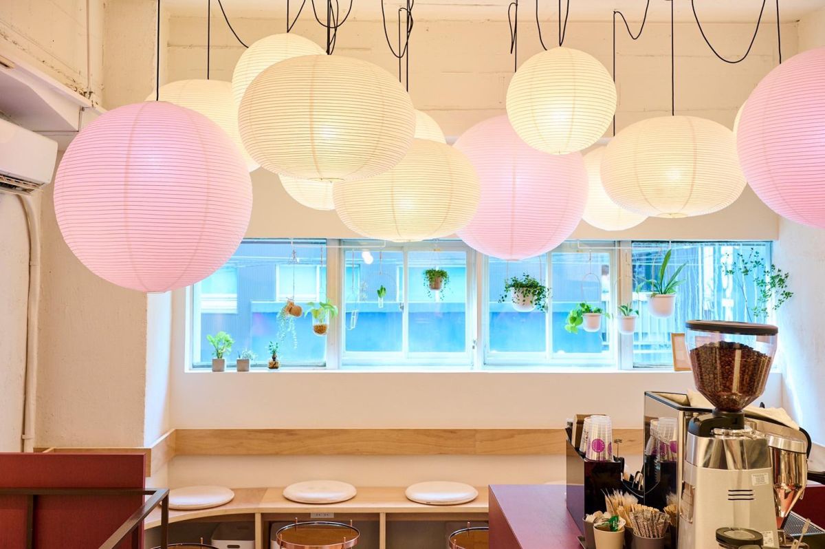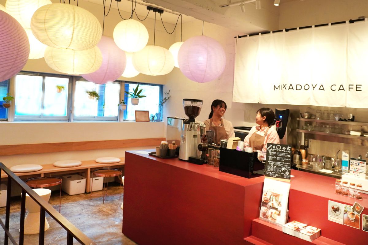 再開発が進む東京・自由が丘の駅前。2022年8月、駅正面から延びるメープル通りに移転した「御門屋 自由が丘店」。その2階に「MIKADOYA CAFE」がオープンしました。階段を上がって2階の店内に入ると、目に飛び込んでくるのは、たくさんのまあるい和紙の照明器具。ぼんぼりのような昼光色や桃色の光が、店内を彩っています。スツールやテーブルも“まる”をモチーフにしたデザインで、明るく和やかな雰囲気で満たされています。