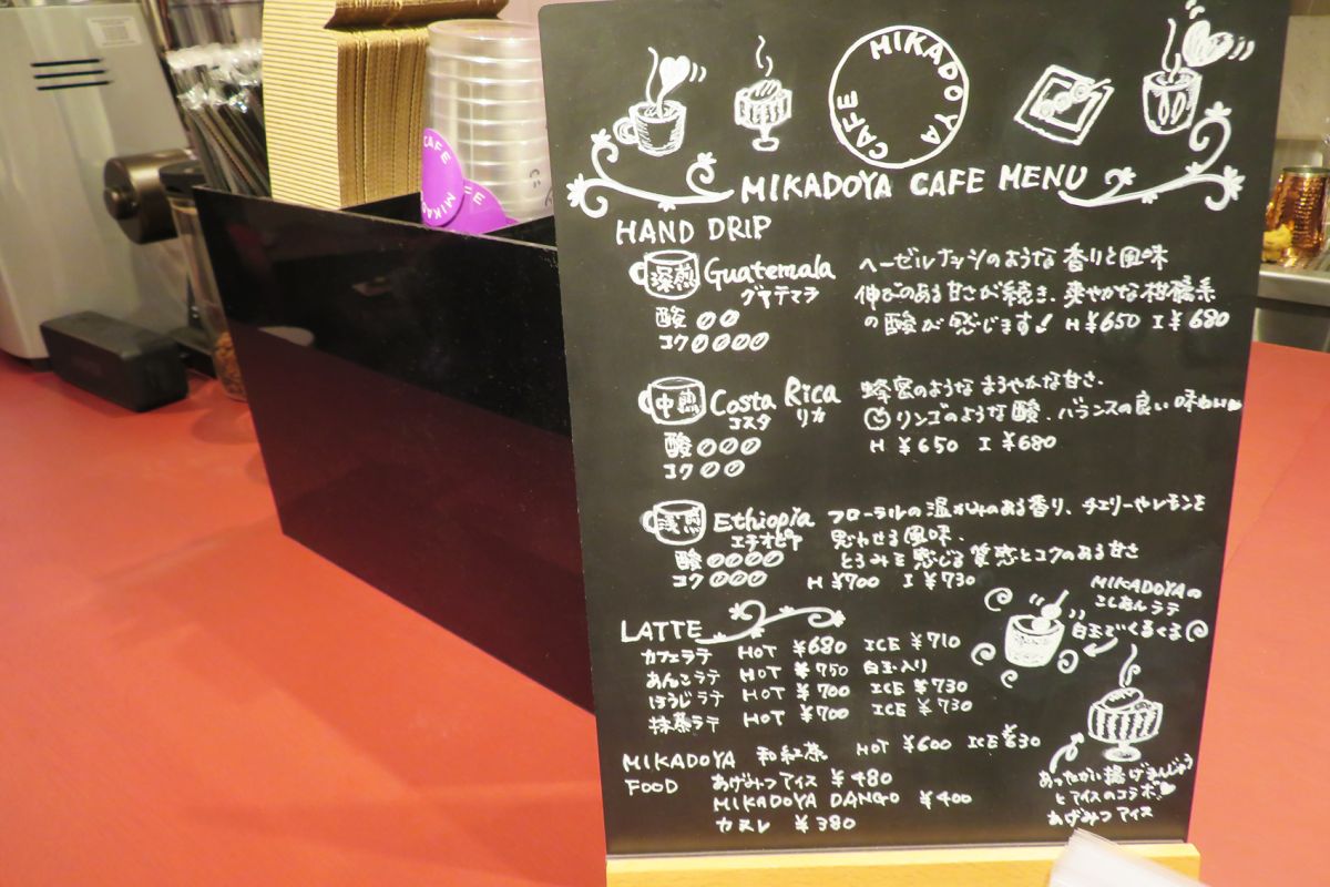 「MIKADOYA CAFE」は、甘味だけでなく、コーヒーもハンドドリップで香り高く入れてくれます。コーヒー豆は、世界中の農園から買い付けたコーヒー豆を、浅煎りから深煎りまでさまざまな焙煎で提供する「OBSCURA COFFEE ROASTERS(オブスキュラ コーヒー ロースターズ)」のものを使用。現在は深煎りの「グアテマラ」ホット650円、アイス680円、中煎りの「コスタリカ」ホット650円、アイス680円、浅煎りの「エチオピア」ホット700円、アイス730円の3種を提供中です。