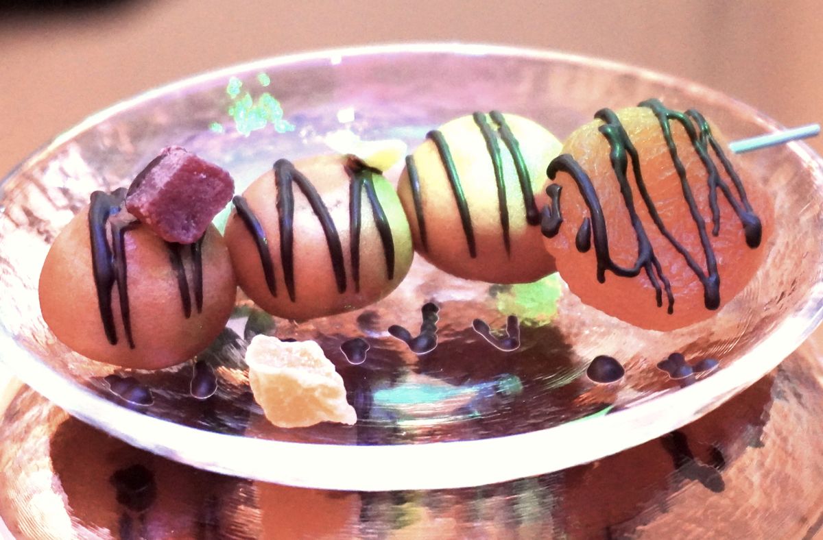 その「AGE TRICO」を使ったカフェメニューが「チョコがけあげだんご」400円。まあるいだんごの中に入っているのは、左からリンゴ餡、みかんピールの餡、桃餡。チョコレートのソースがかけられていて、アンズやパイナップル、メロン、ミカンなどのドライフルーツが添えられています。しっとりとした“あげだんご”とフルーツのコンビネーションが楽しめます。