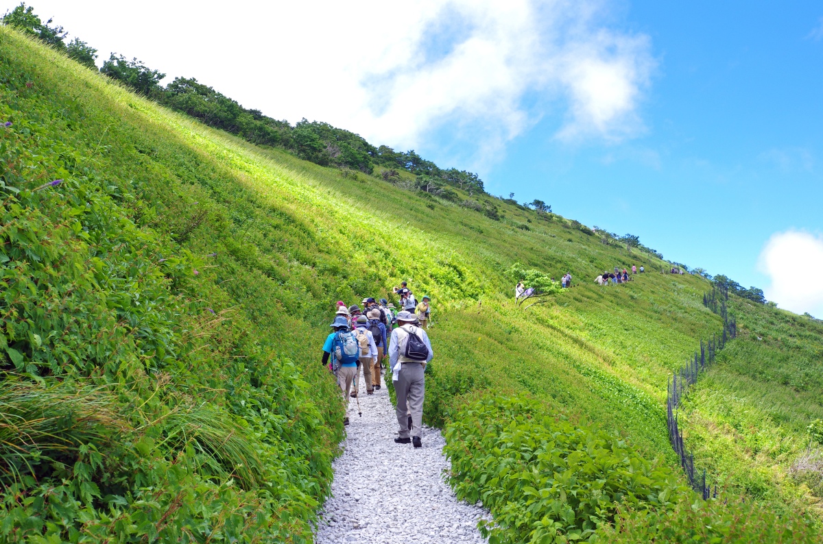 西登山道は片道40分ほど、約1000mの道のりで、最も多くの草花と出合えるコースです。春にはニリンソウやイブキハタザオ、夏には夏にはクガイソウやキンバイソウ、秋にはイブキトリカブトやコイブキアザミなどが咲き、7月中旬〜8月中旬に黄色い花が満開となるキオン群生地も人気です。