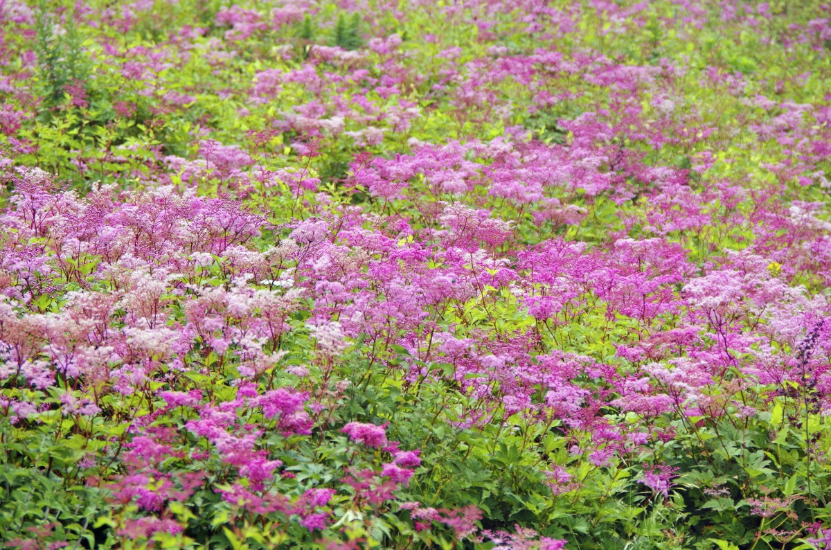 登山道から山頂にかけて多くの花が咲く伊吹山。山頂の空に近い平地には柵に囲われたお花畑があり、初秋ならサラシナショウマやイブキトリカブト、アキノキリンソウ、イブキアザミ、シロヨメナ、リンドウなどが百花繚乱。最も美しい季節は7月中旬〜8月初旬で、伊吹山の夏のお花畑の代名詞と言えるシモツケソウがピンクの花を一面に咲かせます。
