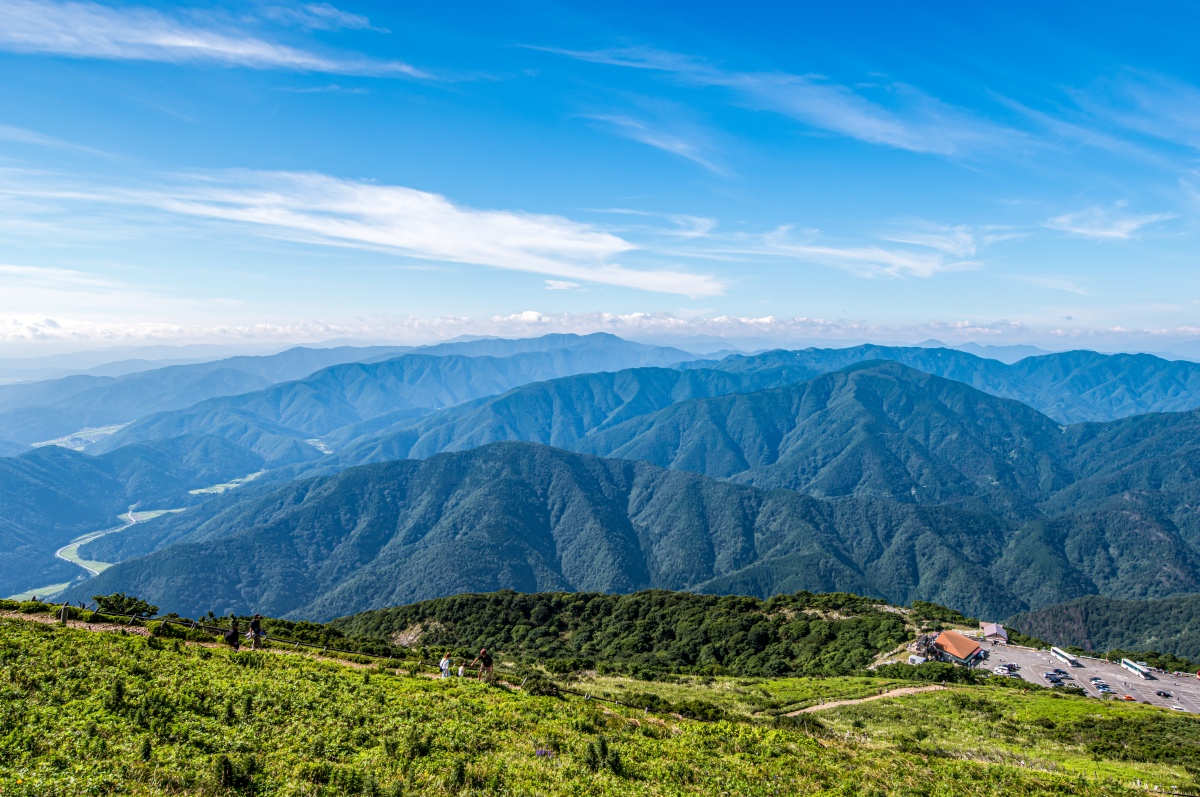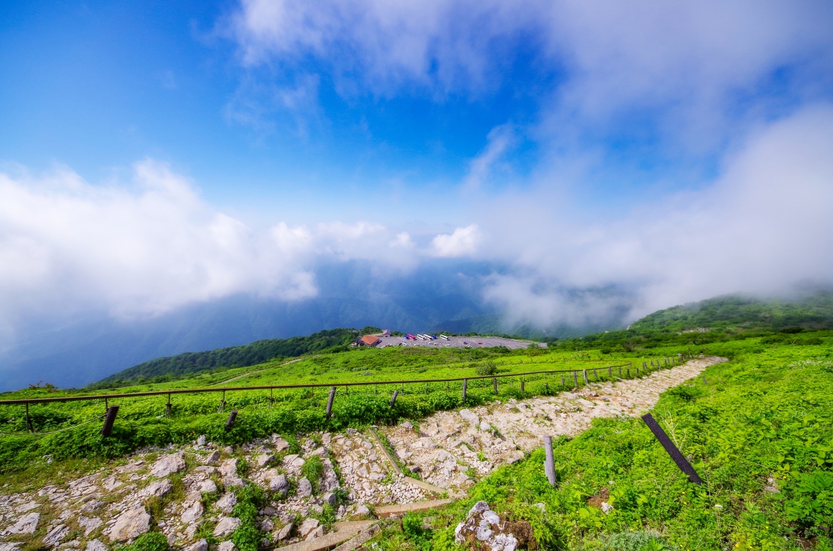 約17㎞の道のりを走ると山頂駐車場に到着! ここは標高1260mの場所にあり、地上の景色が遥かかなたに見える「天空の駐車場」です。山頂駐車場から頂上までは徒歩でのプチ登山に挑戦。登山ルートは3つあり、「西登山道」「中央登山道」、下山専用の「東登山道」が整備されています。