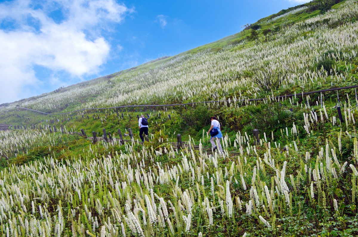 中央登山道は片道約20分の最短コースですが、その分勾配はきつめ。ですが、登山道には木の階段が整備され、比較的登りやすいルートです。秋にはシオガマギクやナギナタコウジュなどが咲きます。また、サラシナショウマの群生地もあり、3ルートの中で最も見応えがあるそうです。9月初め頃から、たくさんの猫のしっぽのような白い花がふわふわ揺れる様子が眺められますよ。