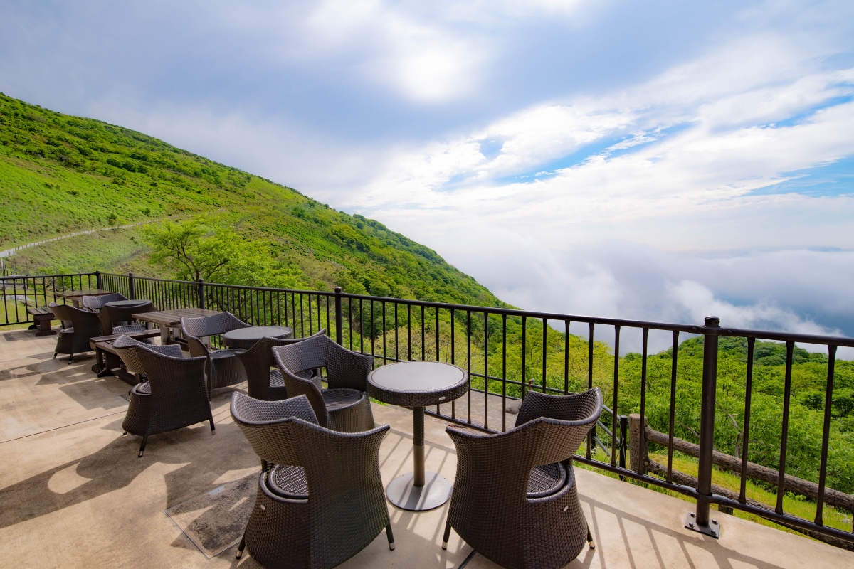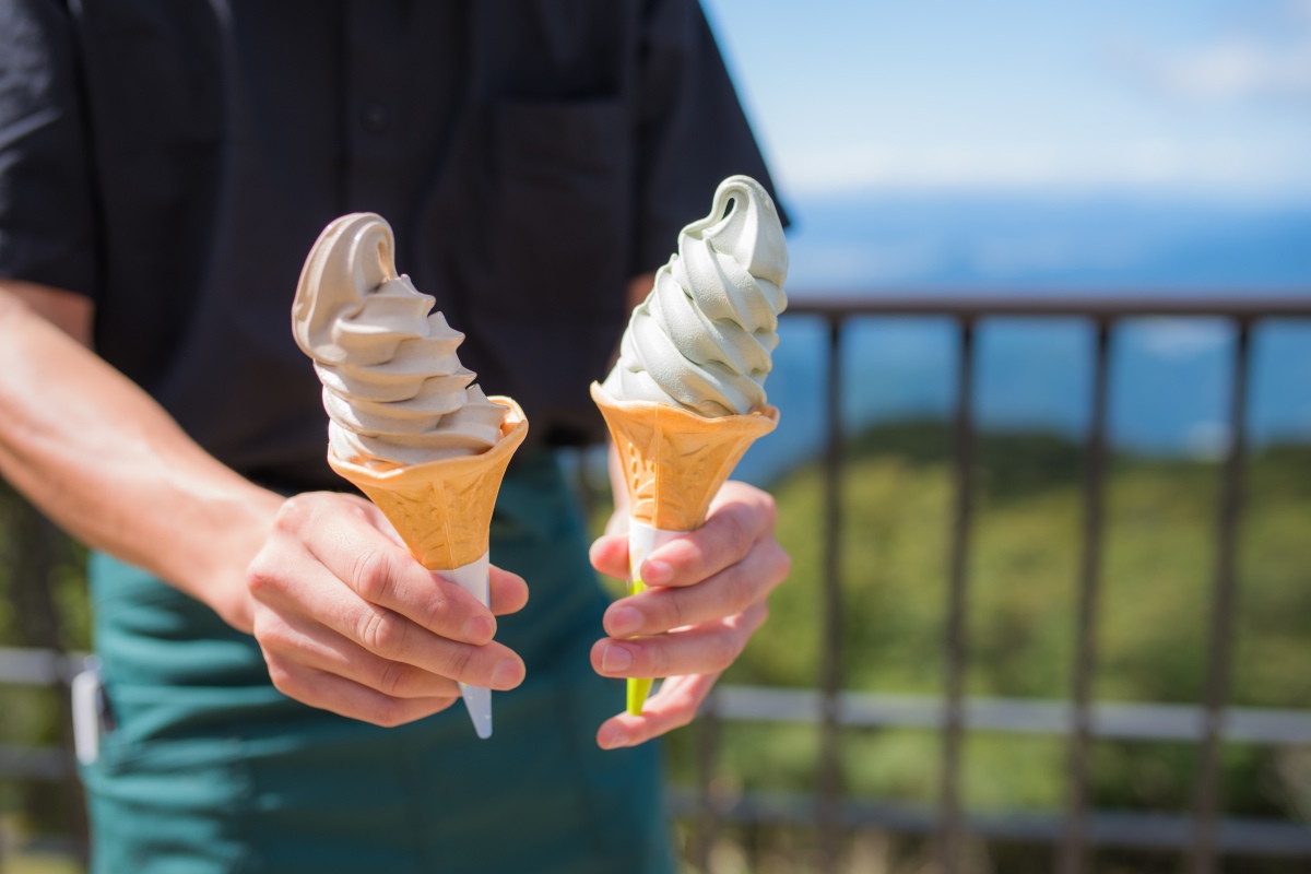 絶景の見納めは、展望デッキから望む琵琶湖と比良山地の雄大な景色。雲がすぐ手に届きそうな場所に椅子があり、ダイナミックな自然の中で軽食メニューも楽しめます。おすすめは、「伊吹薬草ソフトクリーム」や「伊吹よもぎソフトクリーム」といったご当地ソフト。