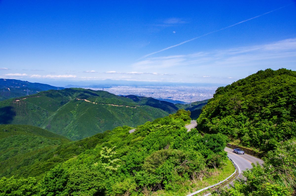 入口料金所にて通行料金3,400円(軽・普通自動車)を支払い、山道を進みます。道幅は広いのでゆったり走行できるのが魅力。走るうちに空に近づくような感覚で、眼下の平野の景色がどんどん遠くに見えていきます。途中、いくつか急カーブが続くつづら折りもあるので、そこは慎重に。
