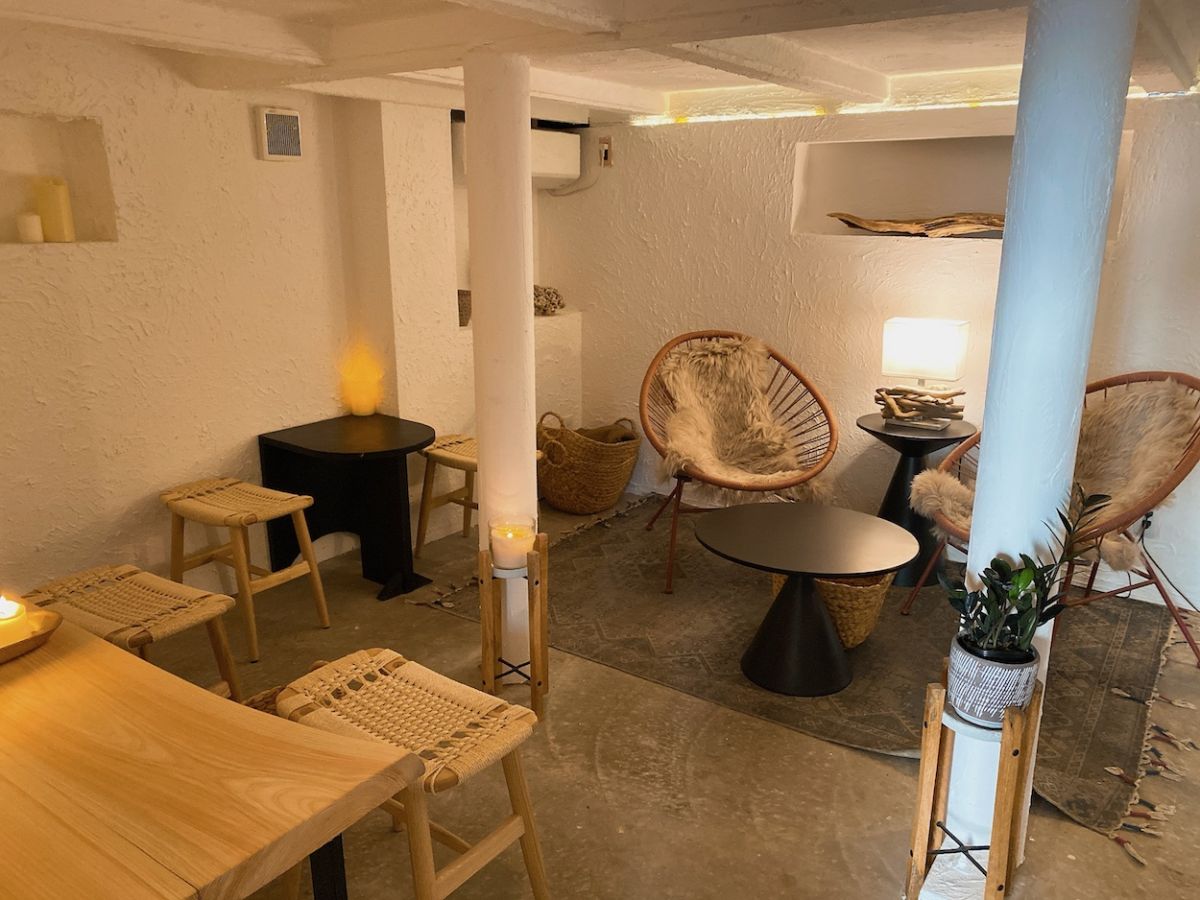 利用できる席は大きく分けて3カ所です。1つ目に紹介するのが店内の最も奥にある空間。イタリアの世界遺産、マテーラの街に広がる洞窟住居をイメージして作られています。天井は低く、壁に囲まれており秘密基地のような雰囲気で、アロマの香りを感じながら落ち着いたひと時を過ごすことができます!