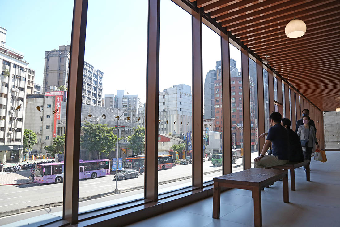 市場は建物の地下1階~地上2階まで。地下1階は野菜・果物などの生鮮食品、1階は乾物や加工食品、2階は百貨(衣類・雑貨)とフードコートです。写真は2階の百貨エリアの休憩スポット。駅前の風景を眺められ、ひと休みにぴったりです。3階より上は台北市役所の関連事務所などが入っています。