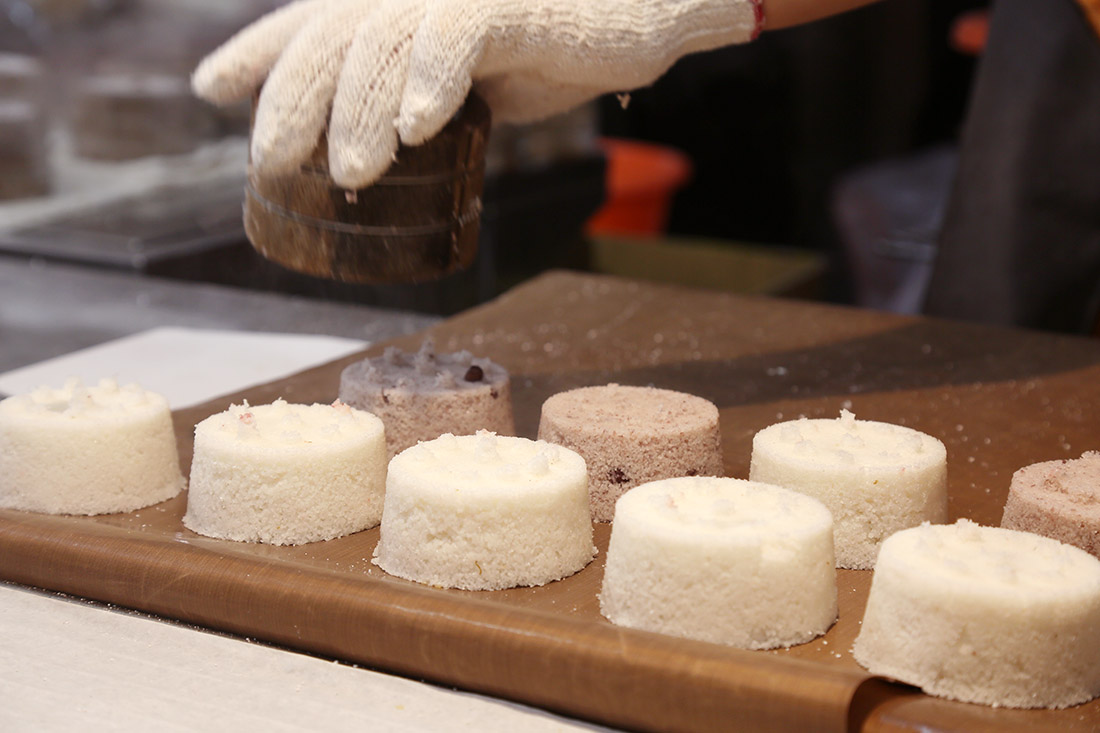 店頭で作っている様子が見られ、飛ぶように売れていくのが「鬆糕(ソンガオ)」1個NT$50。ホクホクと湯気を上げる様子が何とも美味しそう!蓬莱米という台湾産のお米と砂糖が原料で、中に餡を入れて蒸したものです。つぶつぶ食感で、優しい味。常温で2日もち、冷凍も可。もちろん、その場で熱々も食べましょう!