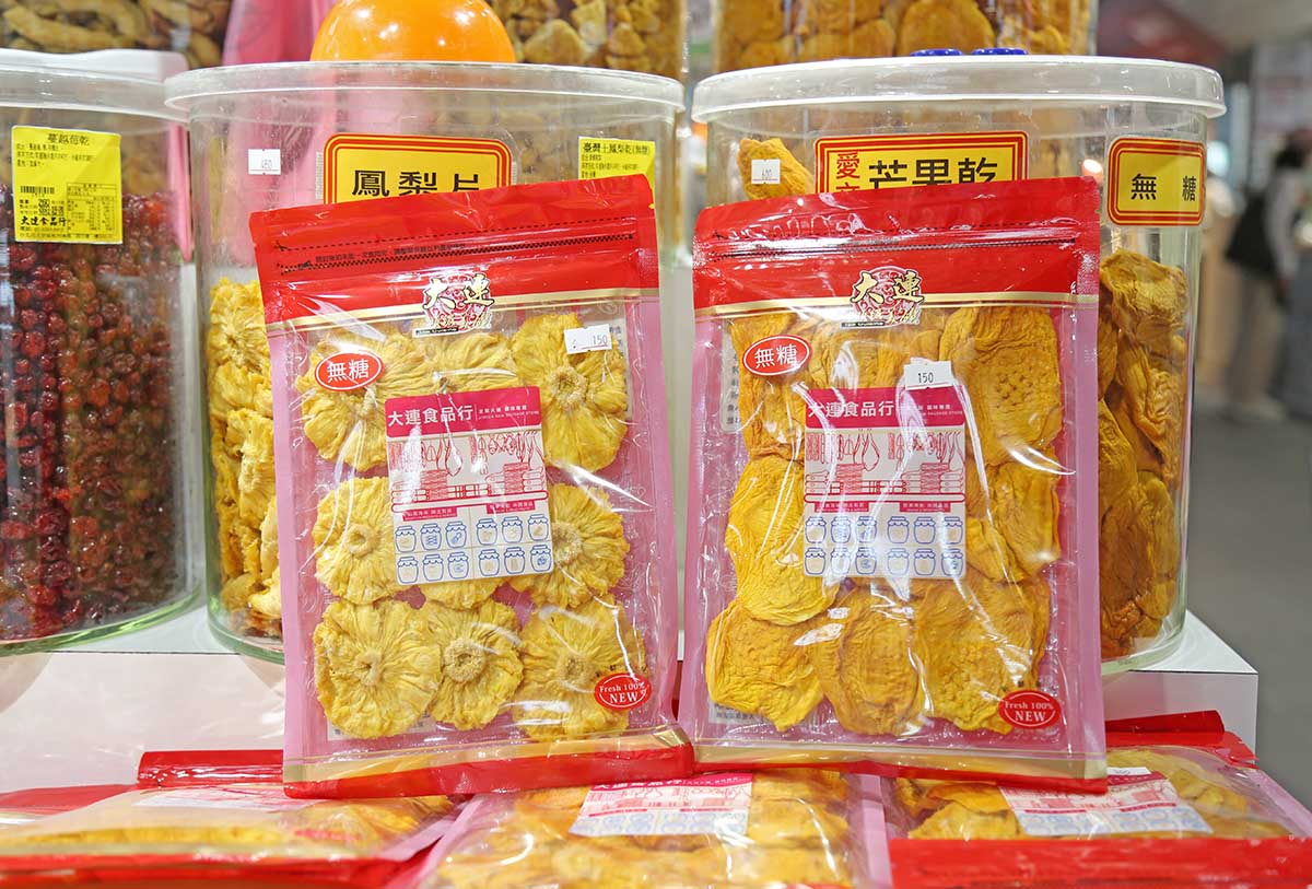 ズラリと並ぶドライフルーツの中でも一番人気は愛文マンゴー(右)とパイナップル。どちらも砂糖は一切加えておらず、自然の甘みなのですが、とっても濃厚!一番小さいサイズはNT$150で、もちろん試食も可。青マンゴーやグァバも人気商品だそうです。