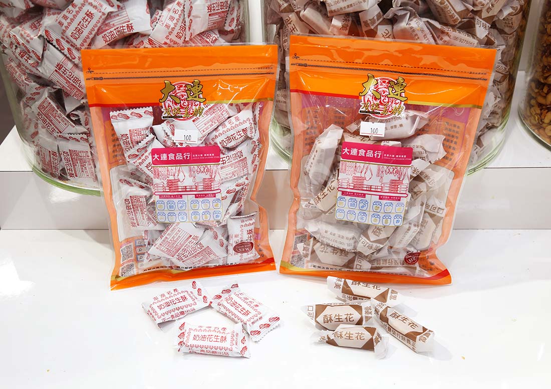 花生酥(ファシェンスー)は今や日本人観光客のおみやげの定番になりつつある、離島・澎湖(ポンフー)名物のピーナッツ菓子。ほろほろ、しっとり、優しい味が人気です。スーパーなどでは手に入らないのですが、ここ「大連食品」では、2大ブランド両方を大量に仕入れているので、いつでも買えるのが嬉しい!NT$100とNT$150の2サイズがあります。