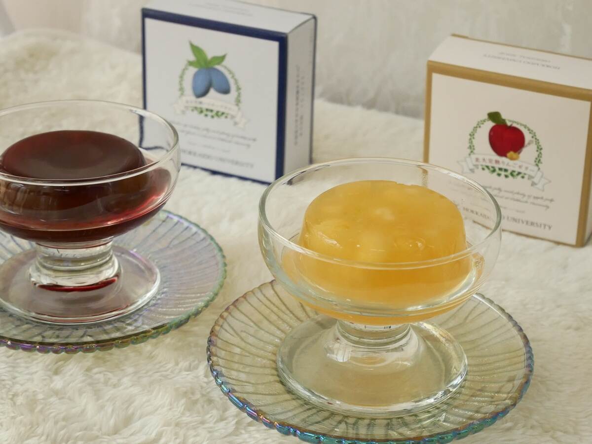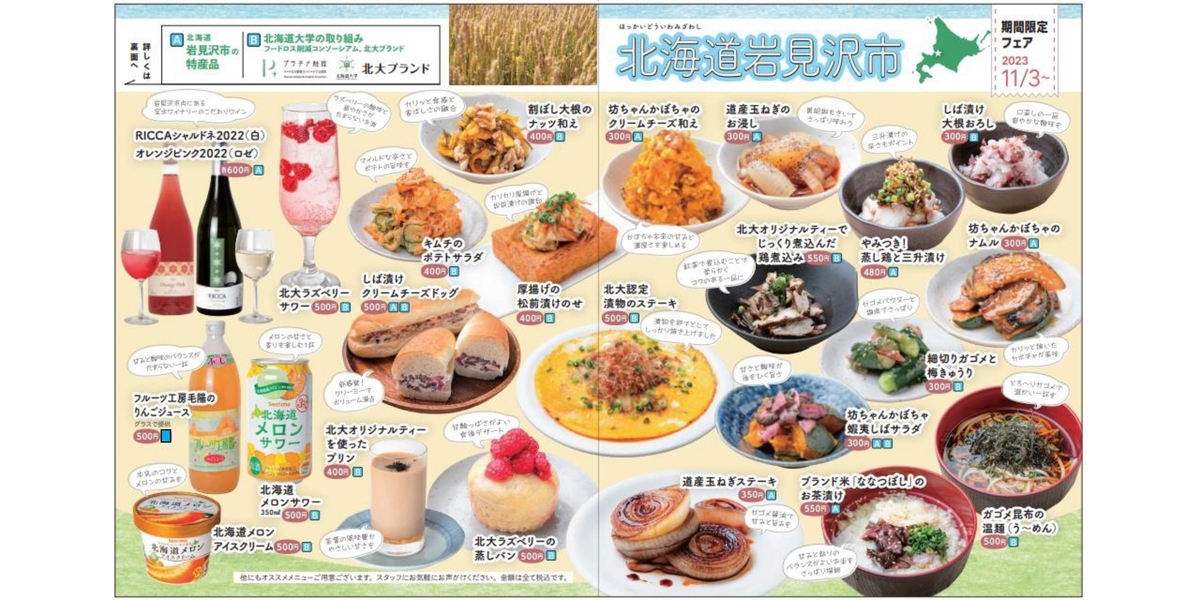 今回の「『るるぶキッチン×北海道岩見沢市』 特集フェア」は北海道大学も協力。「北大ラズベリーサワー」等、北大ブランド商品を使ったメニューやフードロス削減コンソーシアム関連メニューと合わせ、北海道大学が開発した商品をお土産として販売中!おしゃれなパッケージの「北大オリジナルティー」や「北大完熟リンゴゼリー」、北海道ならではのフルーツを使った「北大完熟ハスカップゼリー」などさまざまな商品がずらり。
